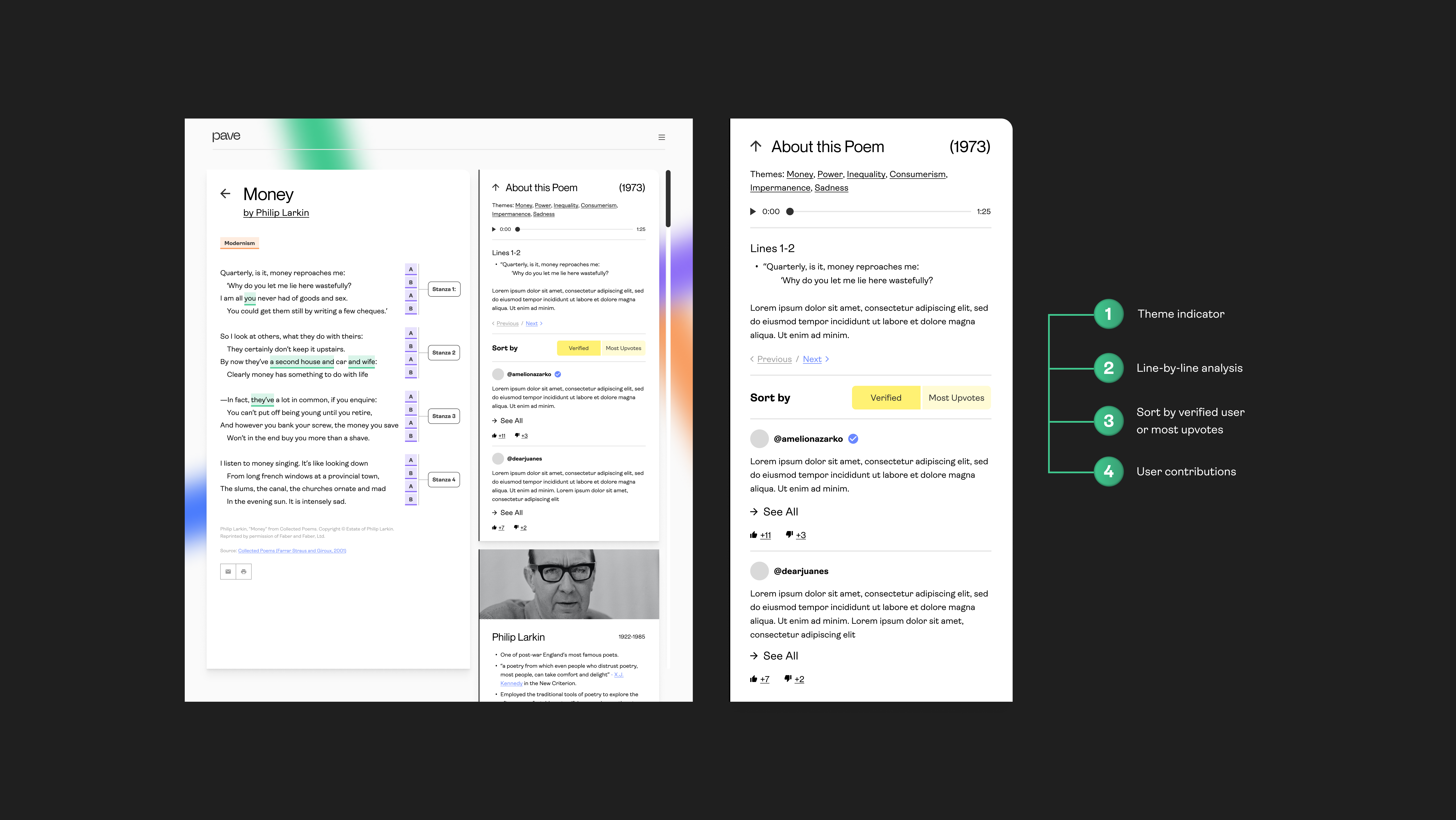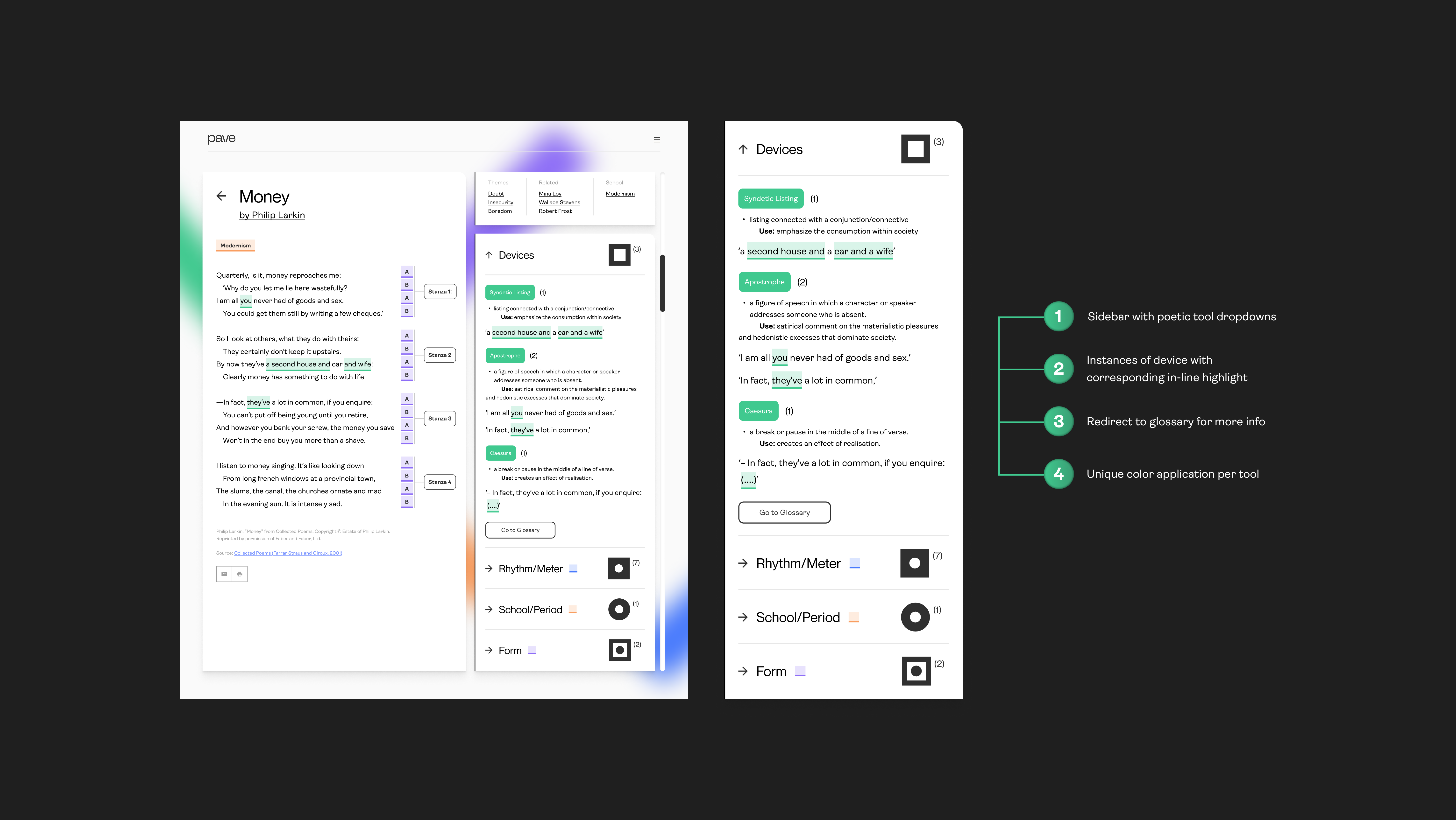 Pave is a poetry decoder that helps users uncover the literary devices at play in a poem. Pave aims to bridge the gap between fast-paced readers and complex poetry through an integrated library with real-time and user-driven analyses.︎︎︎ How Might We?